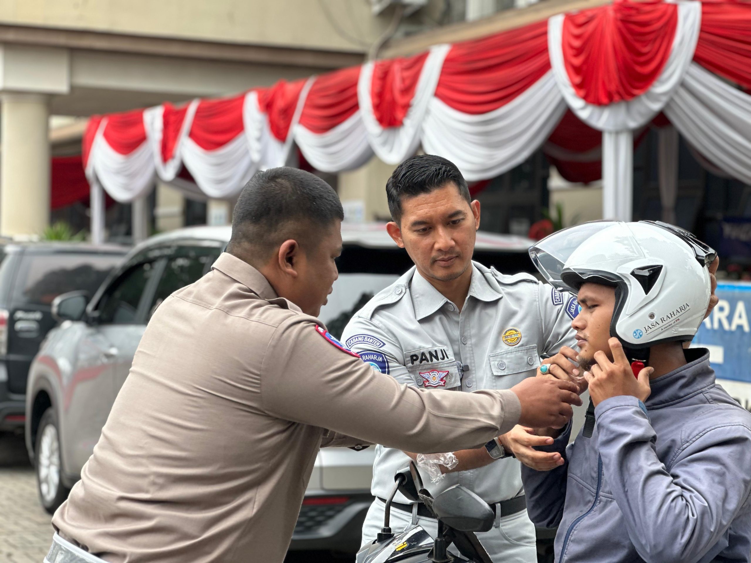 Jasa Raharja Cabang Tangerang dengan UPT Samsat Ciputat, Kepolisian serta Bank Banten menggelar kegiatan pembagian helm secara gratis di UPT Samsat Ciputat kepada wajib pajak yang taat dalam melakukan pembayaran pajak kendaraan bermotor pada Jumat 19 September 2025.