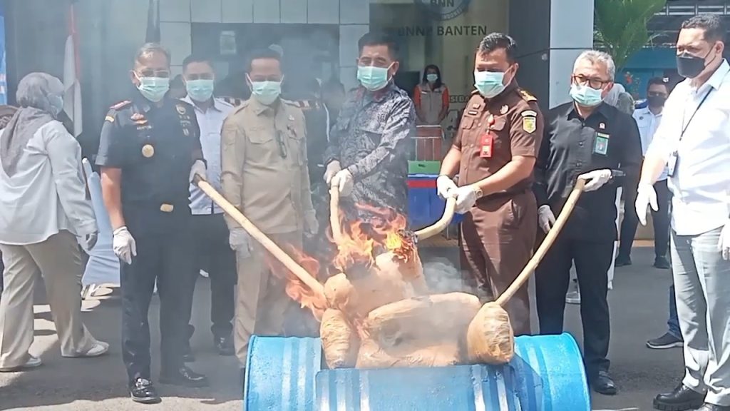 Serang, BantenKita.com — Badan Narkotika Nasional Provinsi (BNNP) Banten memusnahkan barang bukti narkotika berupa ganja seberat 8.494,298 gram dan sabu 93,475 gram. Seluruh narkoba tersebut dimusnahkan tanpa adanya tersangka yang berhasil diamankan.Pemusnahan dilakukan di halaman Gedung BNNP Banten, Selasa (25/11).