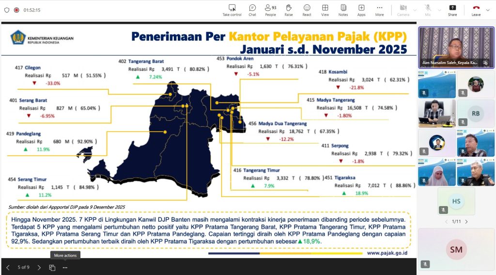 Selanjutnya, Aim Nursalim Saleh, Kepala Kanwil DJP Banten menyampaikan informasi tentang penerimaan pajak Provinsi Banten hingga 30 November 2025. Menurutnya, penerimaan pajak periode tersebut tercapai sebesar Rp59,86 triliun atau 73,47% dari target APBN 2025 sebesar Rp81,48 triliun.