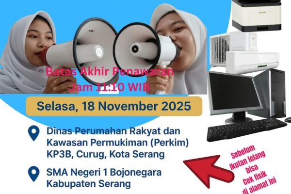 Serang, (BantenKita) – Badan Pengelolaan Keuangan dan Aset Daerah (BPKAD) Provinsi Banten membuka kesempatan bagi masyarakat untuk mengikuti lelang Barang Milik Daerah (BMD) secara terbuka melalui aplikasi resmi pemerintah lelang.go.id. Lelang akan dilaksanakan pada Selasa, 18 November 2025 bekerja sama dengan Kantor Pelayanan Kekayaan Negara dan Lelang (KPKNL) menggunakan sistem open bidding tanpa kehadiran fisik peserta….